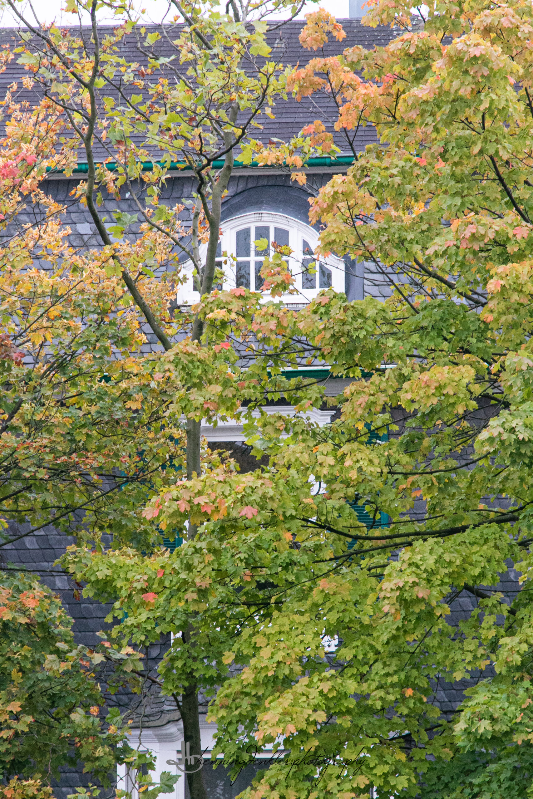 Der Kirchenbau ist für sich genommen architektonisch nicht besonders speziell, doch befindet sich direkt vor dem Kirchturm ein großer, schmiedeeisern umzäunter Vorplatz mit einem wundervoll gewachsenen Baum. Auf der linken Seite zur Kirche hin zieht sich ein kleiner Park, der direkt zum Kindergarten und Gemeindezentrum reicht. Viel Grün also und Kirchplätze strahlen ja ohnehin immer Ruhe aus. Dass neben dieser Ansammlung von Natur direkt das Firmengebäude der Firma Putsch steht und damit einen krassen Gegensatz abbildet zur oben beschriebenen Stimmung, steht nach meinem Geschmack durchaus für die Stadt Remscheid: eine Arbeiterstadt mit lebendiger Industrie(-geschichte), die dennoch sehr kurze Wege bietet, um diesem Rummel zu entkommen.